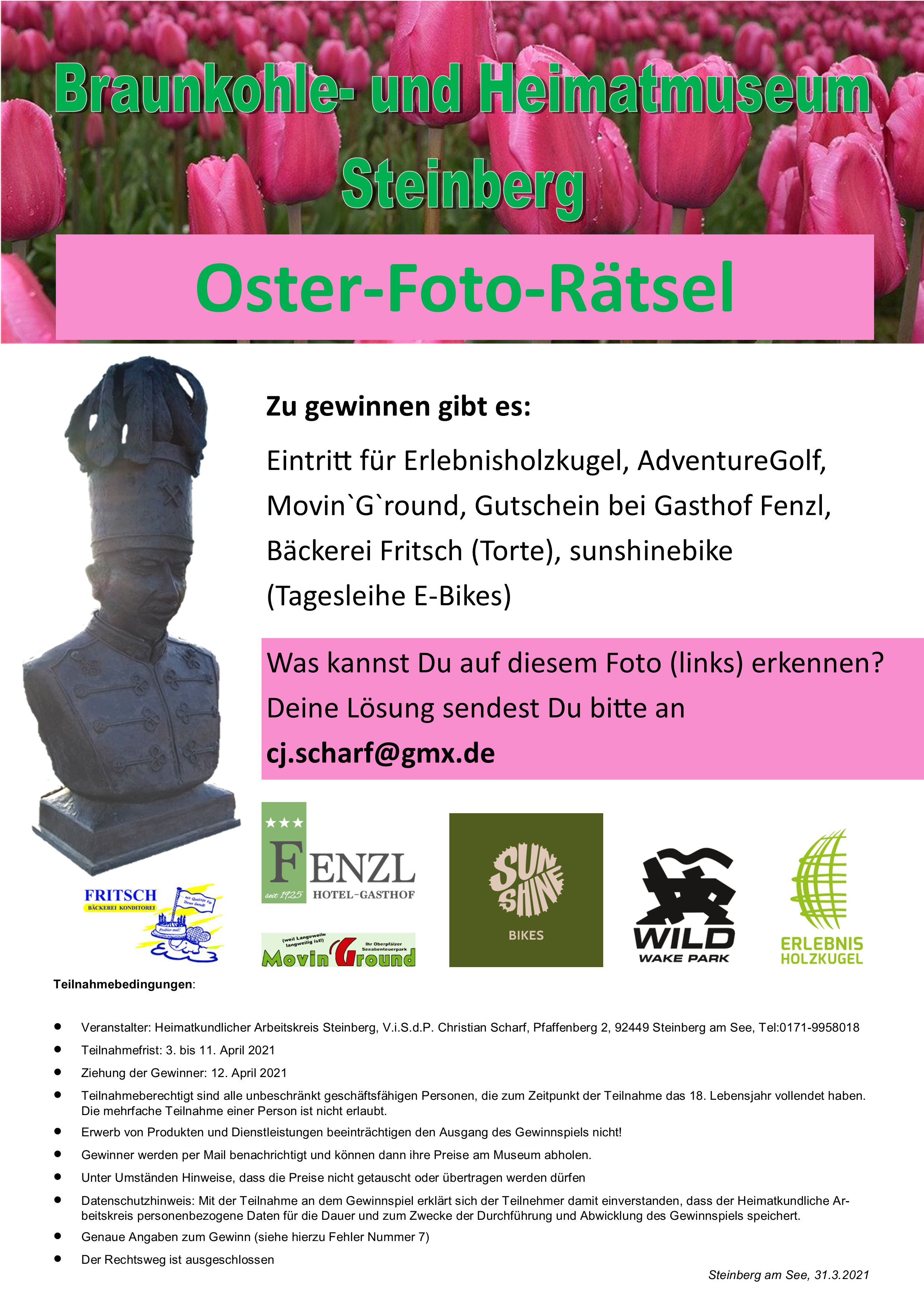 Zu gewinnen gibt es: Eintritt für Erlebnisholzkugel, AdventureGolf, Movin`G`round, Gutschein bei Gasthof Fenzl, Bäckerei Fritsch (Torte), sunshinebike (Tagesleihe E-Bikes) Die Aktion läuft vom 3. bis 11. April – am 12. April werden die Sachpreise unter den per Mail eingegangenen richtigen Lösungen verlost.