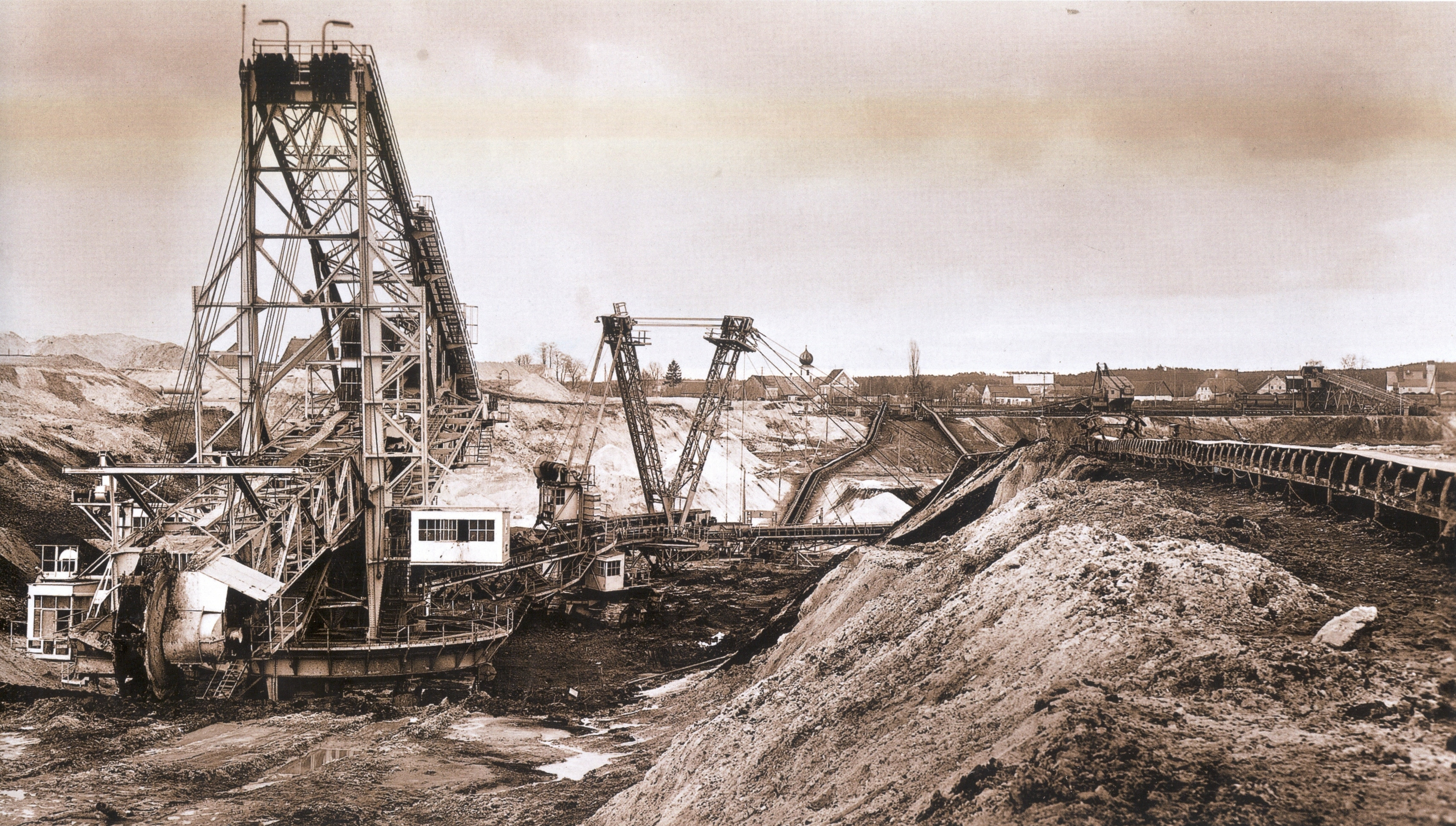 Eines von unzähligen Fotodokumenten aus dem Steinberger Braunkohlemuseum. Heute undenkbar: die Kohle wurde von den Förderbändern in der Ortsmitte verladen und die Kohlezüge fuhren Tag und Nacht mitten durch Steinberg