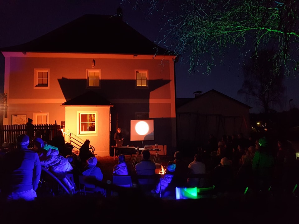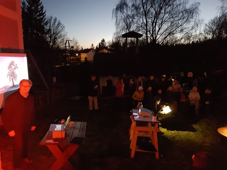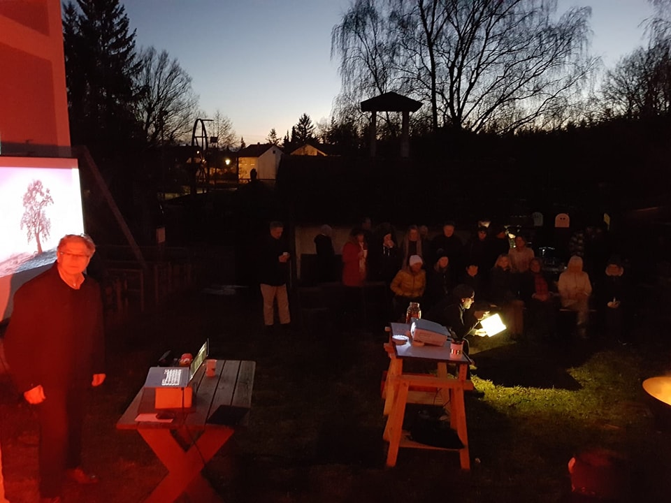 Nahezu 70 Besucher waren der Einladung gefolgt und versammelten sich um das Lagerfeuer im Museumsgarten, den Stefan Royer bunt illuminiert hatte.