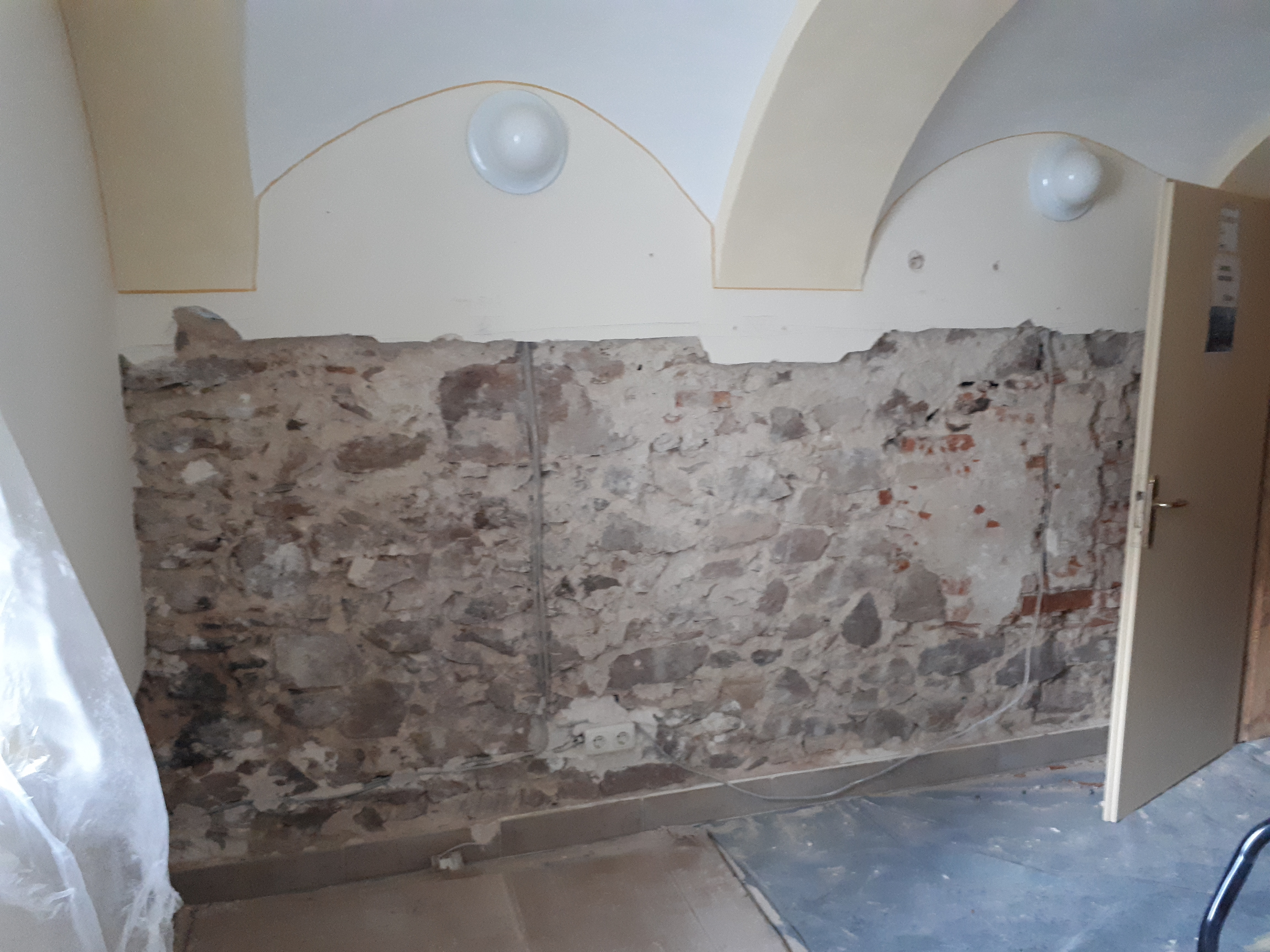 Malermeister Josef Gruber ist mit Hochdruck daran, die nassen Wände zu sanieren. Dazu misst er den Feuchtegehalt und den Salpeterbefall aller Wände, um dann zielorientiert und nicht pauschal den betroffenen Putz reinigen darf...