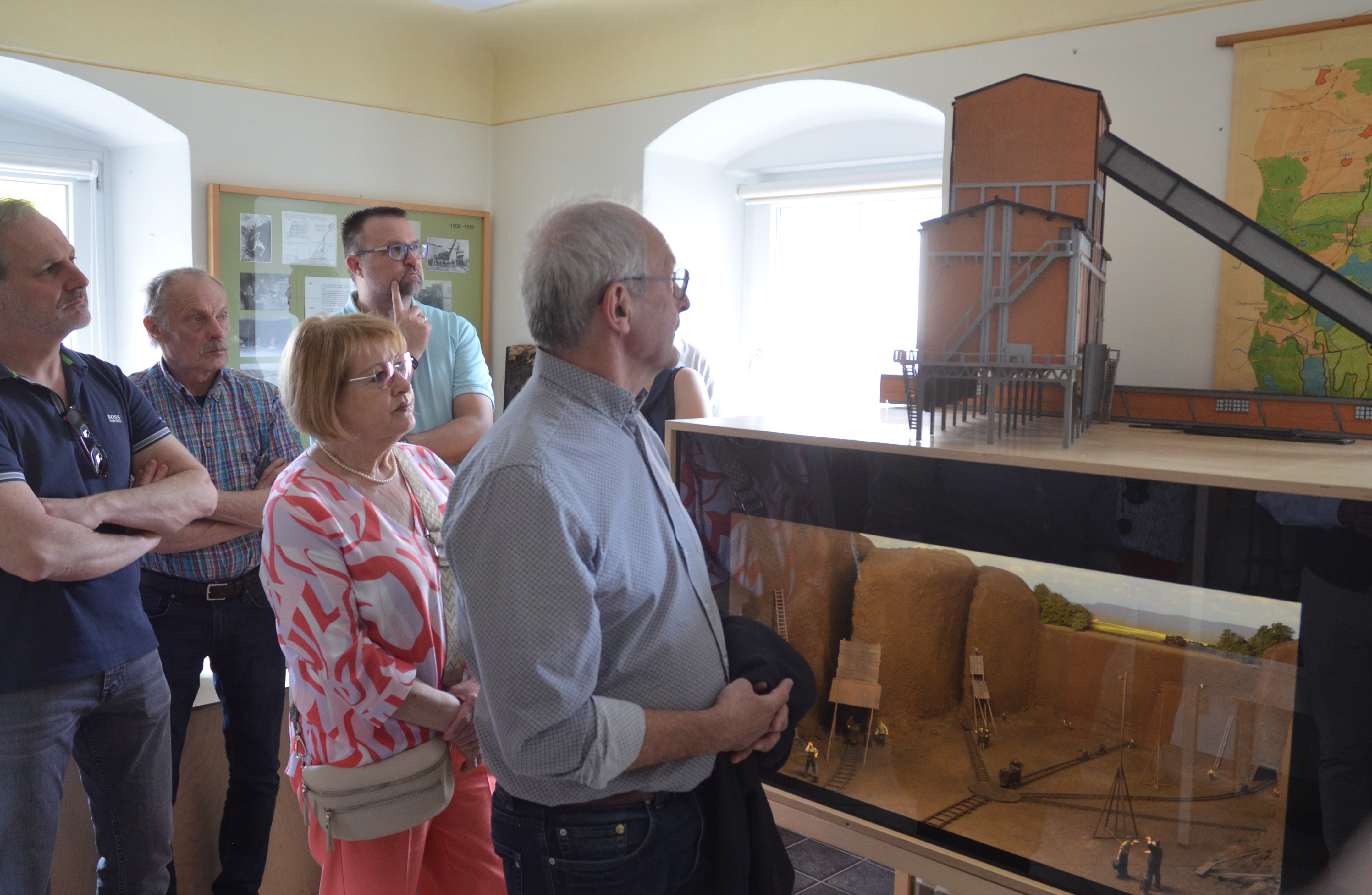 Beim anschließenden Rundgang durch die neu gestalteten Räume im Erdgeschoss erläuterte Christian Scharf den Gästen das neue Konzept, wobei im ersten Raum die BBI-Geschichte chronologisch aufgezeigt wird. In zwei Vitrinen wird hier auch die Bergmannstradition mit diversen Exponaten veranschaulicht. Der Museumsleiter lenkte die Aufmerksamkeit der Besucher auch auf einen Modell-Nachbau des Hochbunkers aus dem Jahre 1928. Bis zuletzt stand das Verlade-Bauwerk an der heutigen Industriestraße. Im zweiten Raum wird jetzt die Schulgeschichte präsentiert, denn hier wurde 1852 das erste Schulhaus eingerichtet. Eine alte Schulbank, Klassenfotos und diverse Schulutensilien erinnern hier an die Schulzeit. Im benachbarten Sakralraum waren die Gäste zu einem Sektumtrunk eingeladen. Bei angenehmen vorsommerlichen Temperaturen servierten die HAK-Damen im Museumsgarten Kaffee und Kuchen. Für den musikalischen Rahmen sorgte die siebenköpfige Gruppe „Zamgspuit“. Bei ihrem erstmaligen Auftritt im Museumsgarten heimsten die Musiker mit Dame reichlich Beifall ein.